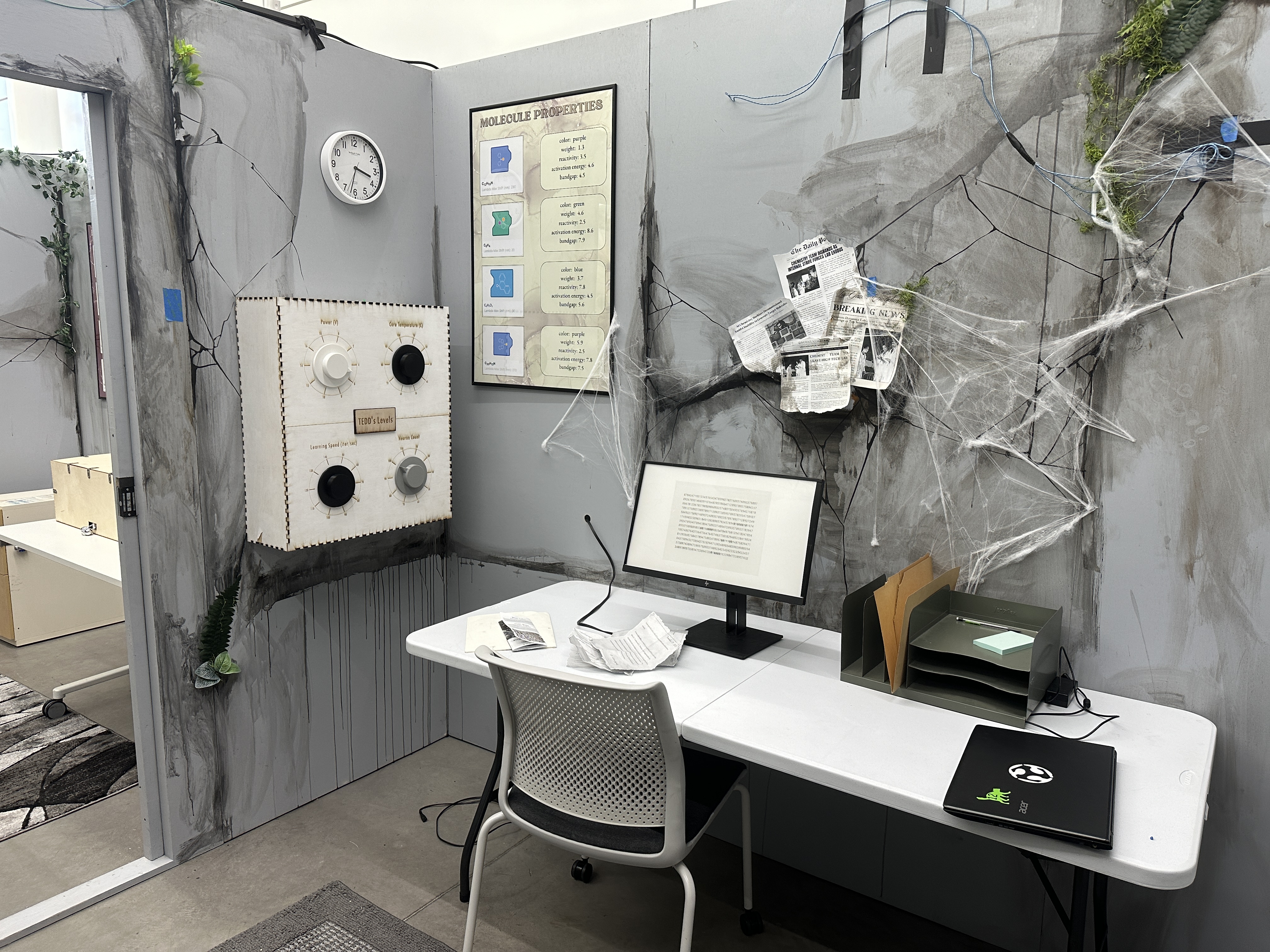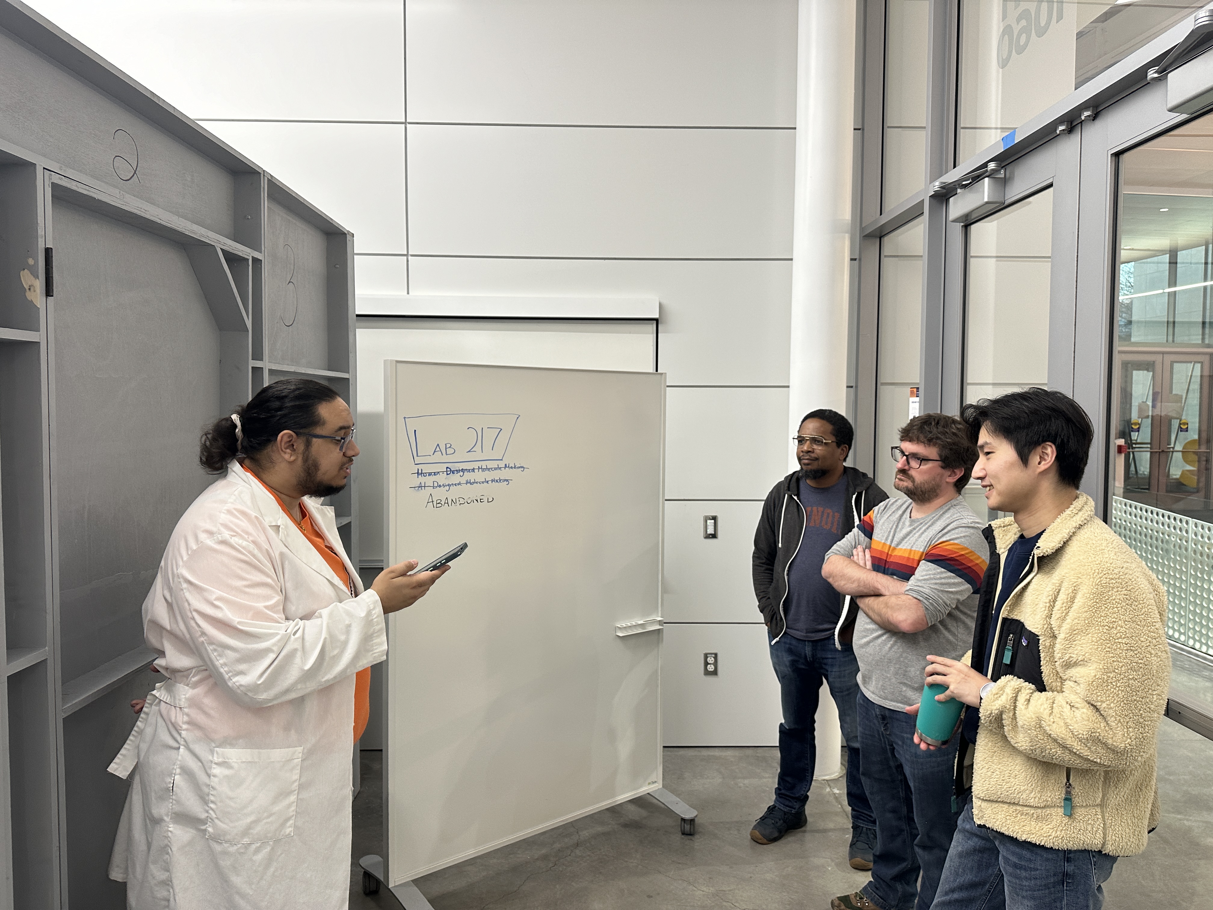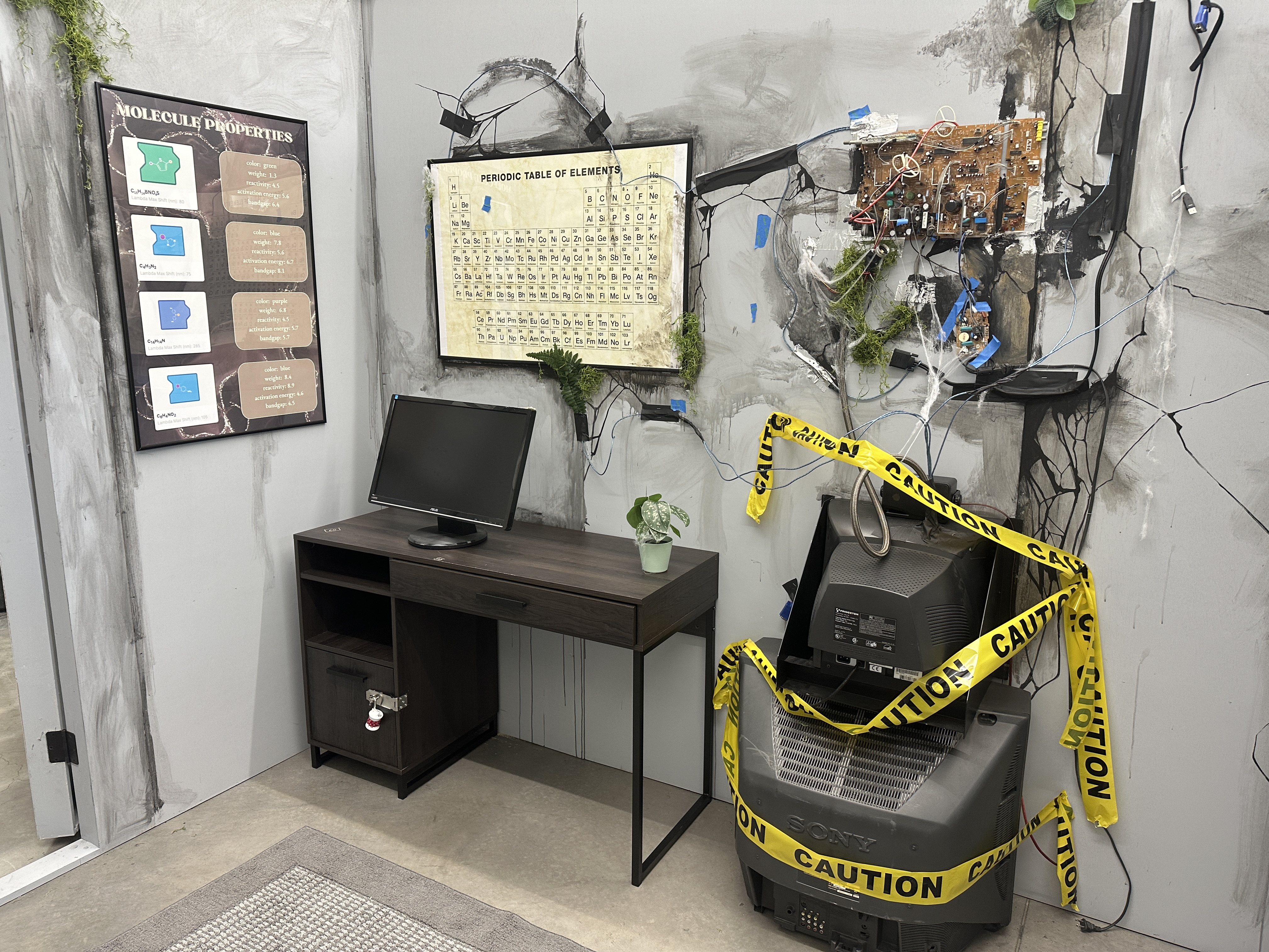 “Lab 217” is an escape room being hosted in SCD’s Moonlight Bay, a residency space that allows for large projects over a short timeframe, such as assembling and playtesting this experience. The escape room is a multidisciplinary, collaborative project that is designed, fabricated, and run by students in two courses. The classes partnered with James Planey and the Molecule Maker Lab Institute (MMLI) to develop a 45-minute puzzle room experience for middle and high school students to introduce them to and get them excited about molecule making. Students in THEA 591: Designing Immersive Experiences, taught by Amber Dewey Schultz, designed the theme, narrative, and multisensory environment, while students in INFO 418: Makerspace - Escape Rooms, taught by Emilie Butt and Duncan Baird, designed and fabricated the puzzle.