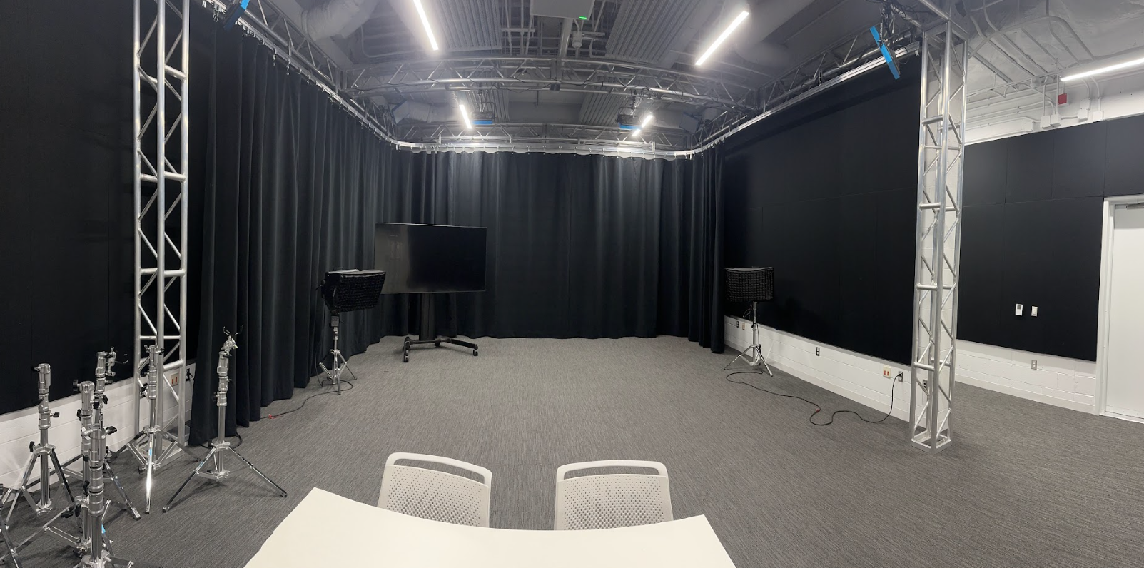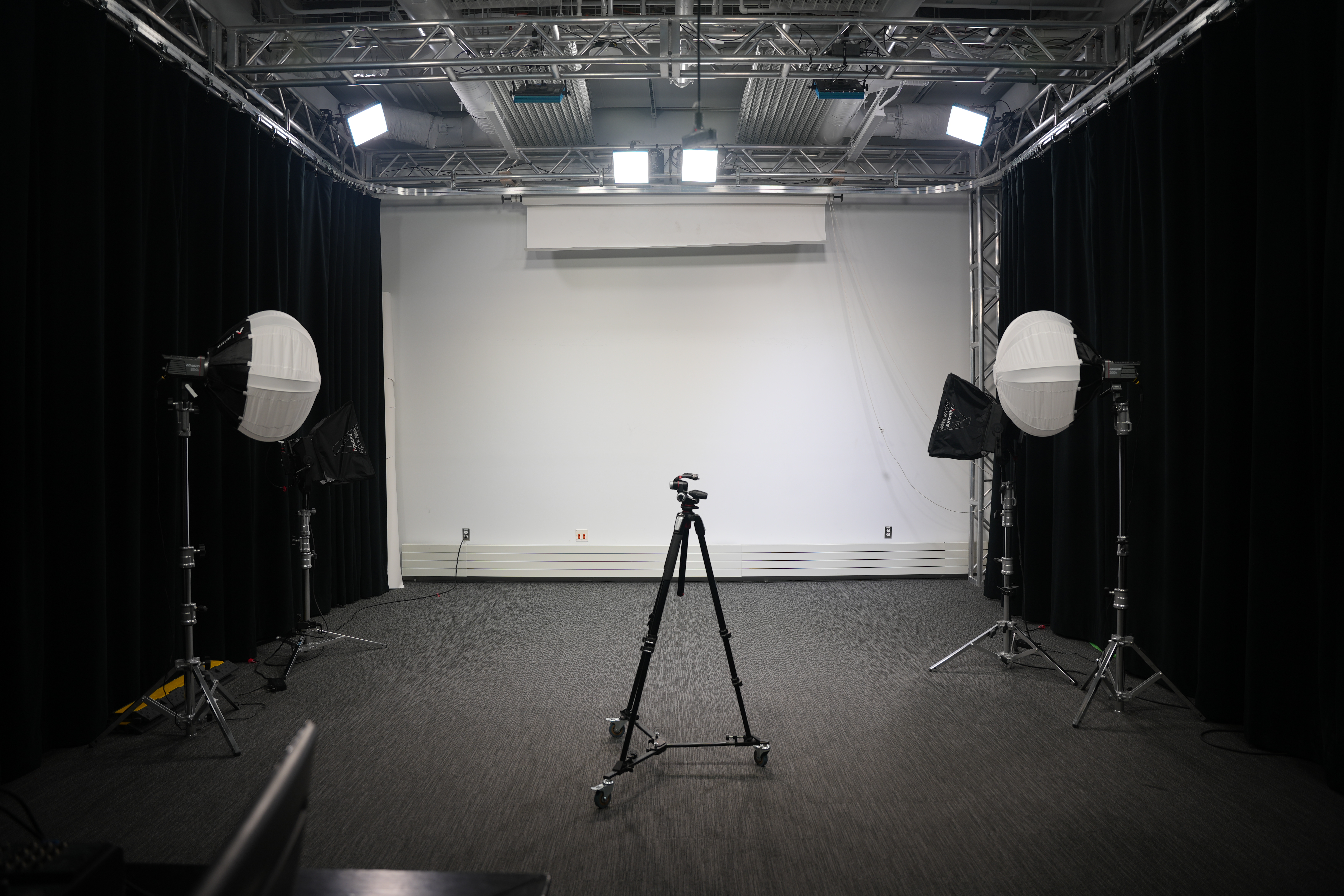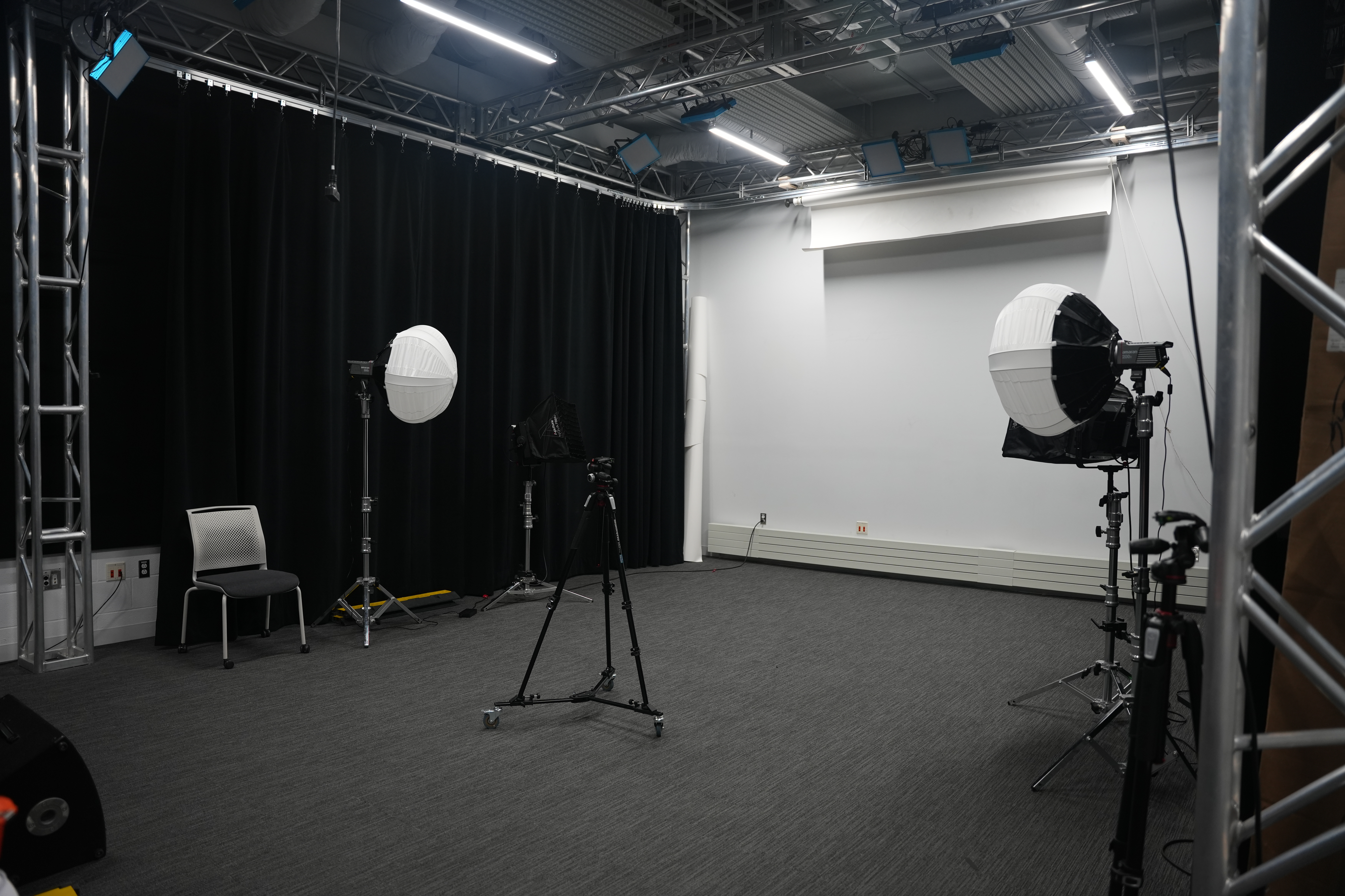 The Media Studio is a content creation and production space that includes an 18' by 18' stage area under a lighting grid, acoustic treatment, curtains and a green screen, flexible equipment and furniture, and a custom-built control desk that acts as recording booth and editing suite. The Labs and Media Studio are open Tuesday - Friday from 4pm-10pm and Saturday - Sunday from 1-6pm when classes are in session.