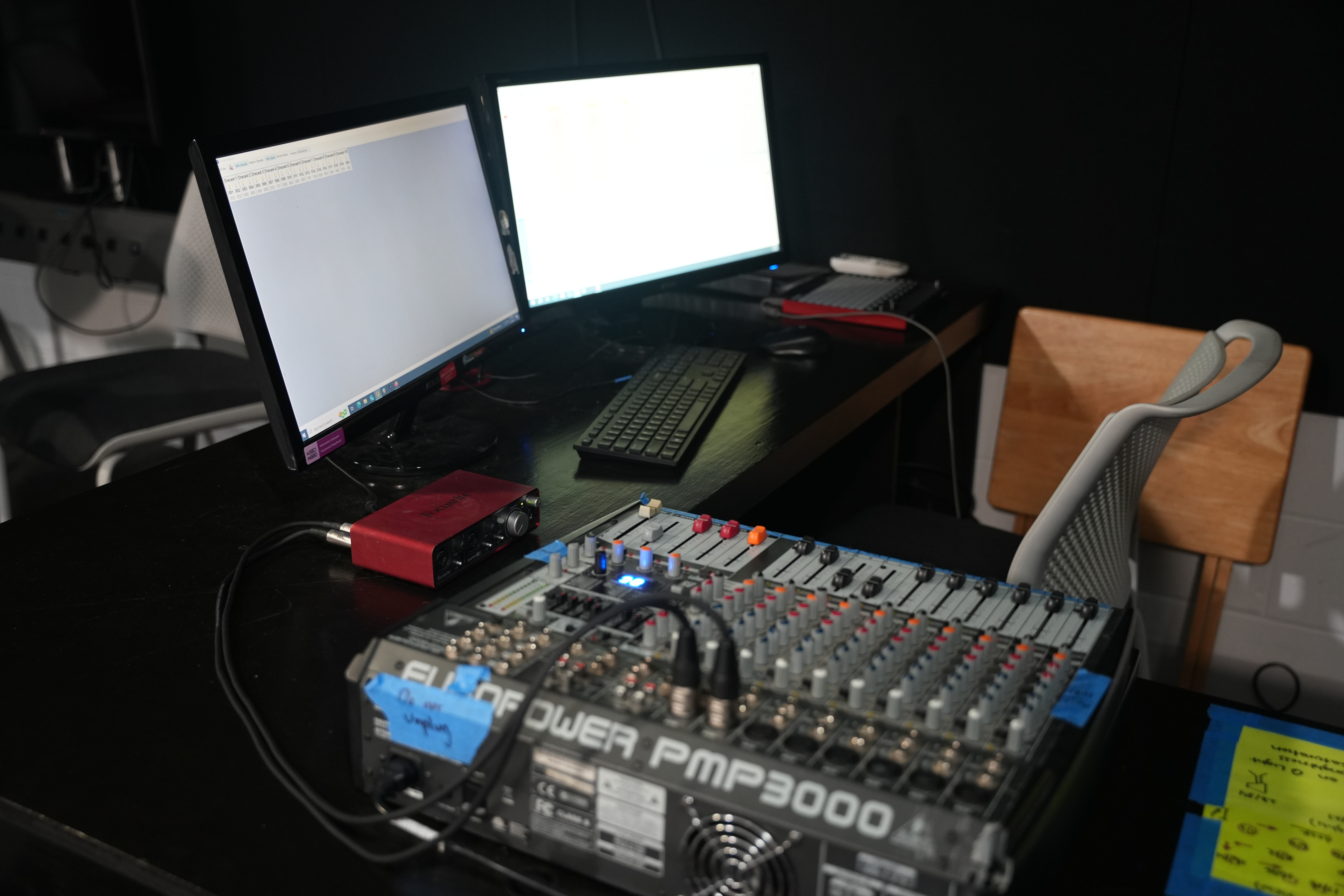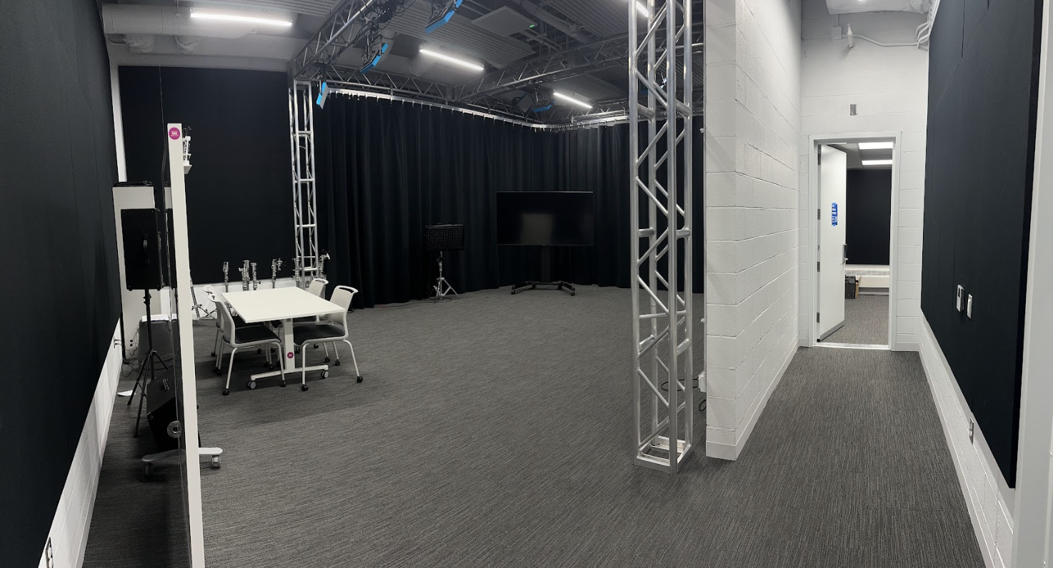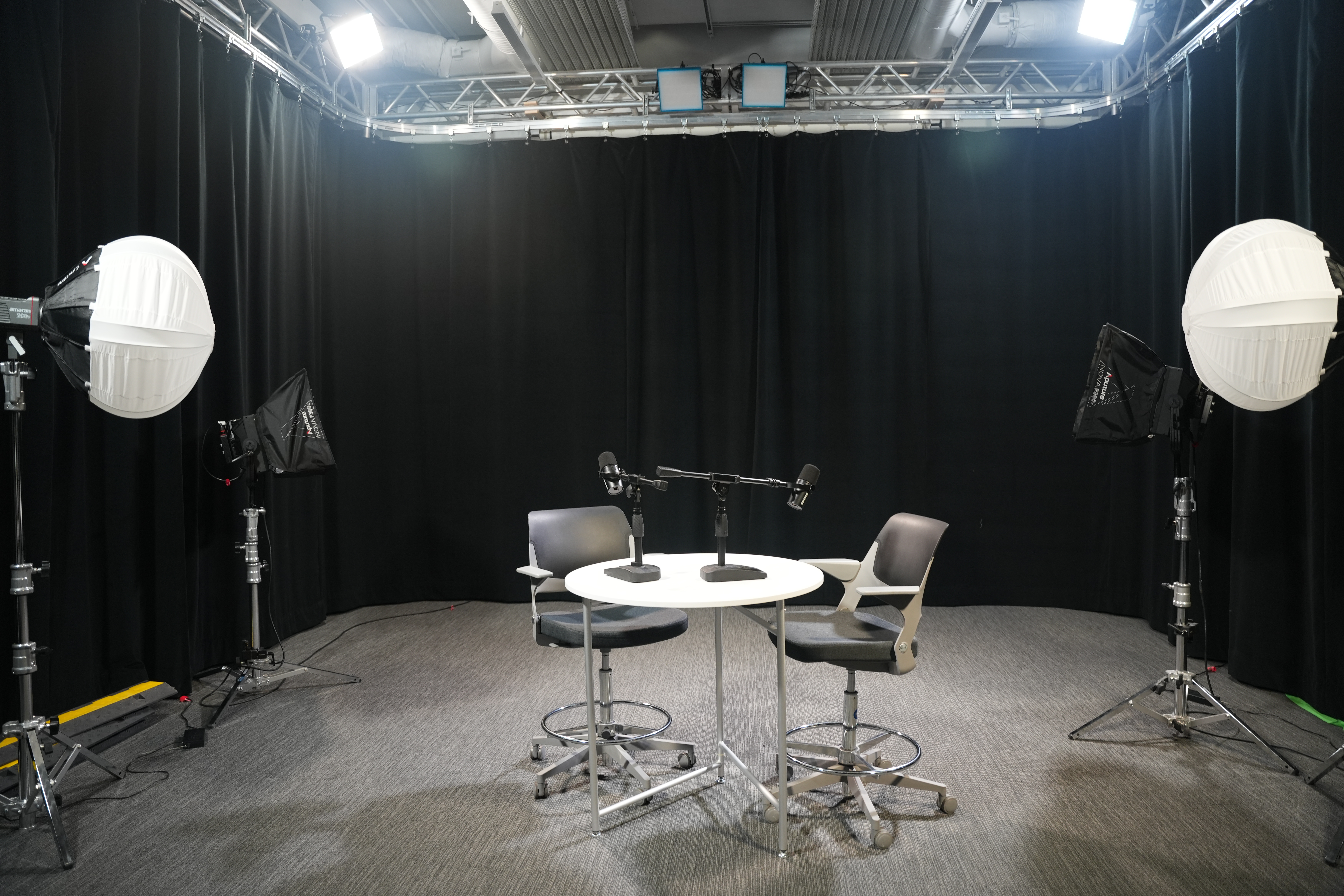 The Media Studio is a content creation and production space that includes an 18' by 18' stage area under a lighting grid, acoustic treatment, curtains and a green screen, flexible equipment and furniture, and a custom-built control desk that acts as recording booth and editing suite. The Labs and Media Studio are open Tuesday - Friday from 4pm-10pm and Saturday - Sunday from 1-6pm when classes are in session.