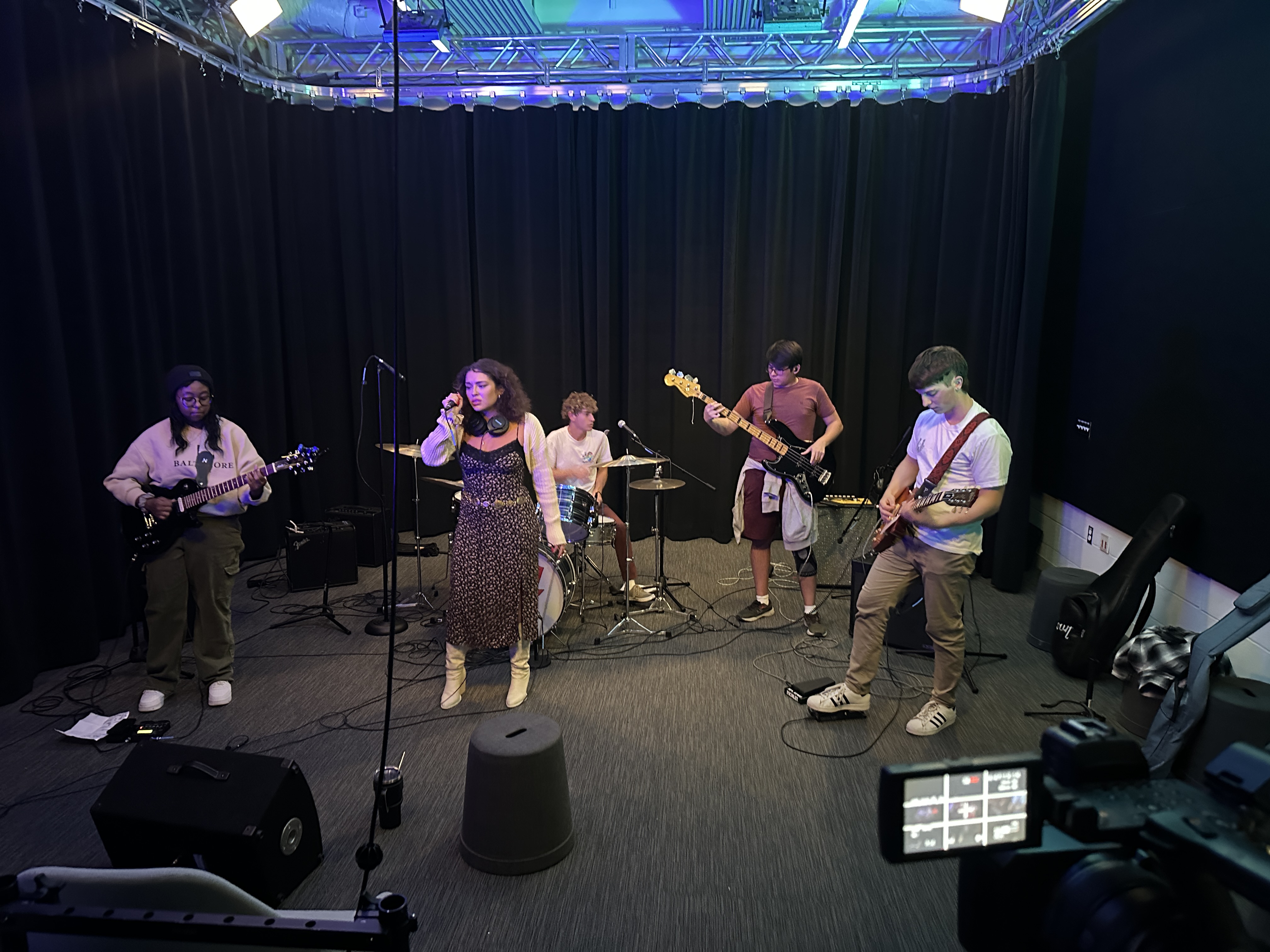 Our next iteration was two days before the concert, where one of the bands, The Meantime, was able to run a full sound check in the Studio. Unfortunately, we did not get a drum set this time, so we focused on guitar amps, vocals, and stage setup for the camera. We first identified a problem here that would continue throughout the first concert, where the podcast recording device could not handle the feed from the mixer board, causing a very crunchy sound when the full band played. We only had two days to make an adjustment and no other equipment to bring in for a better recording, so our next several prototypes had to happen on the fly between acts.