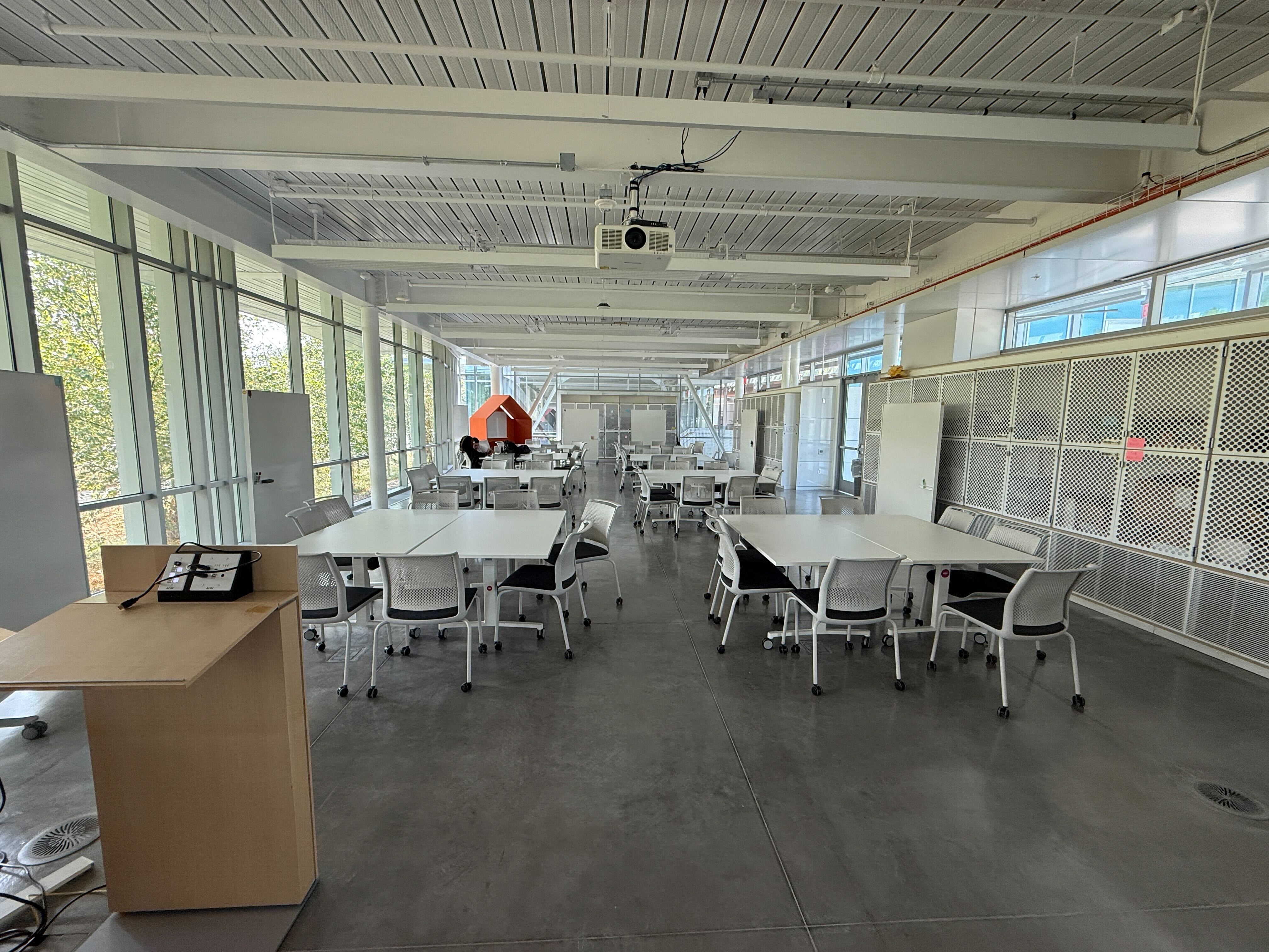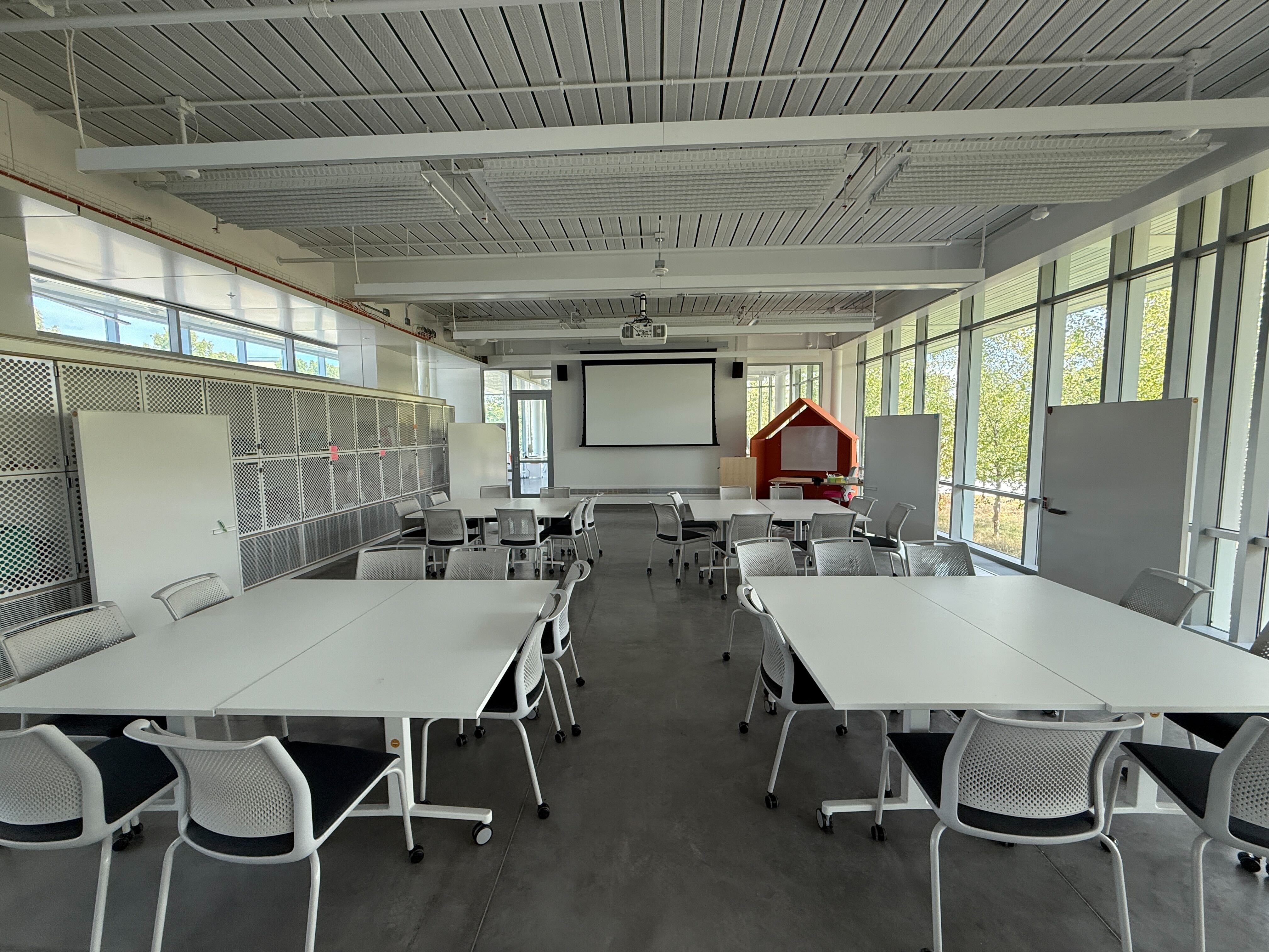 This space comes with flexible seating and tables. The maximum capacity for this space is 65 people and all activities must stay within this limit for the safety of all guests.