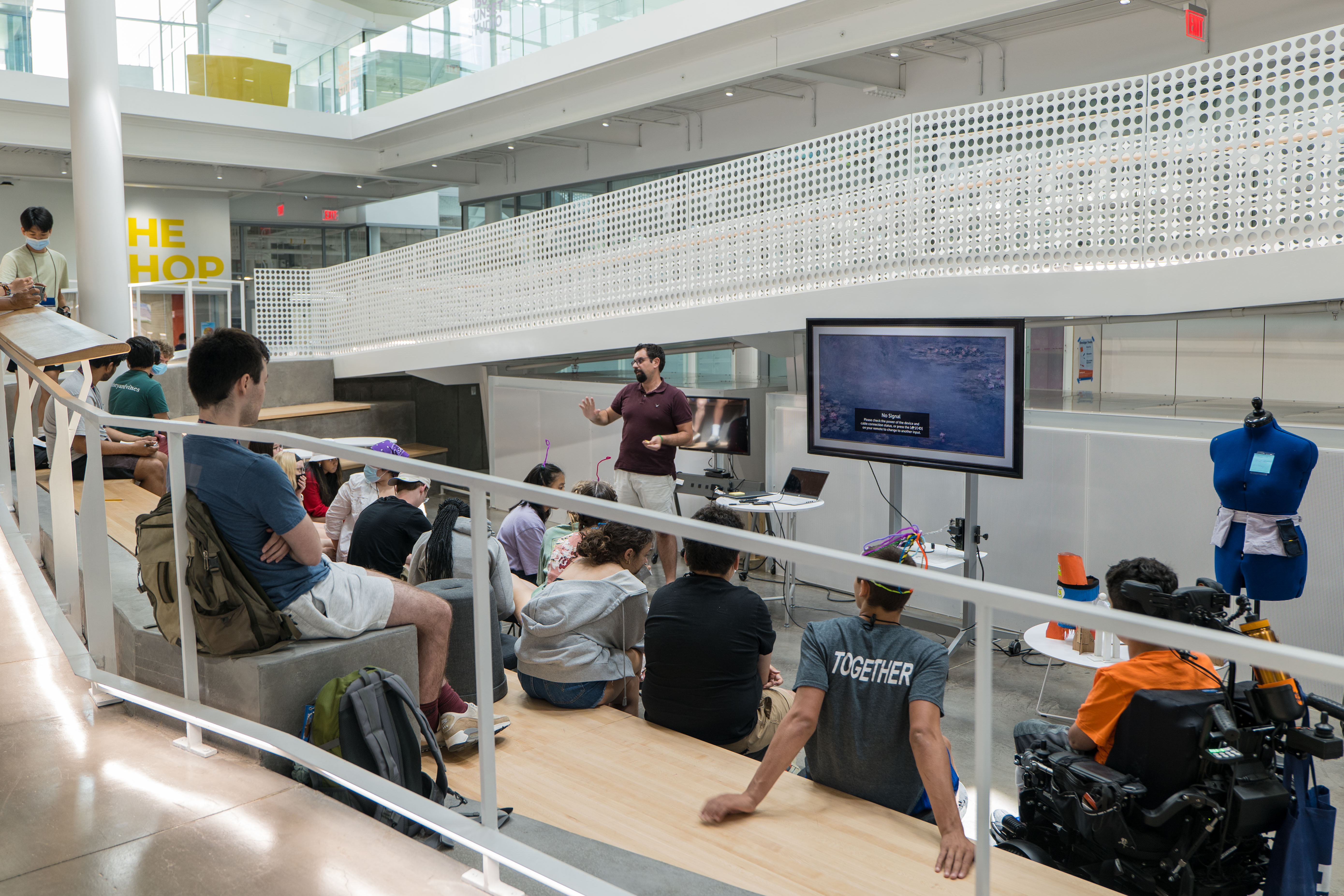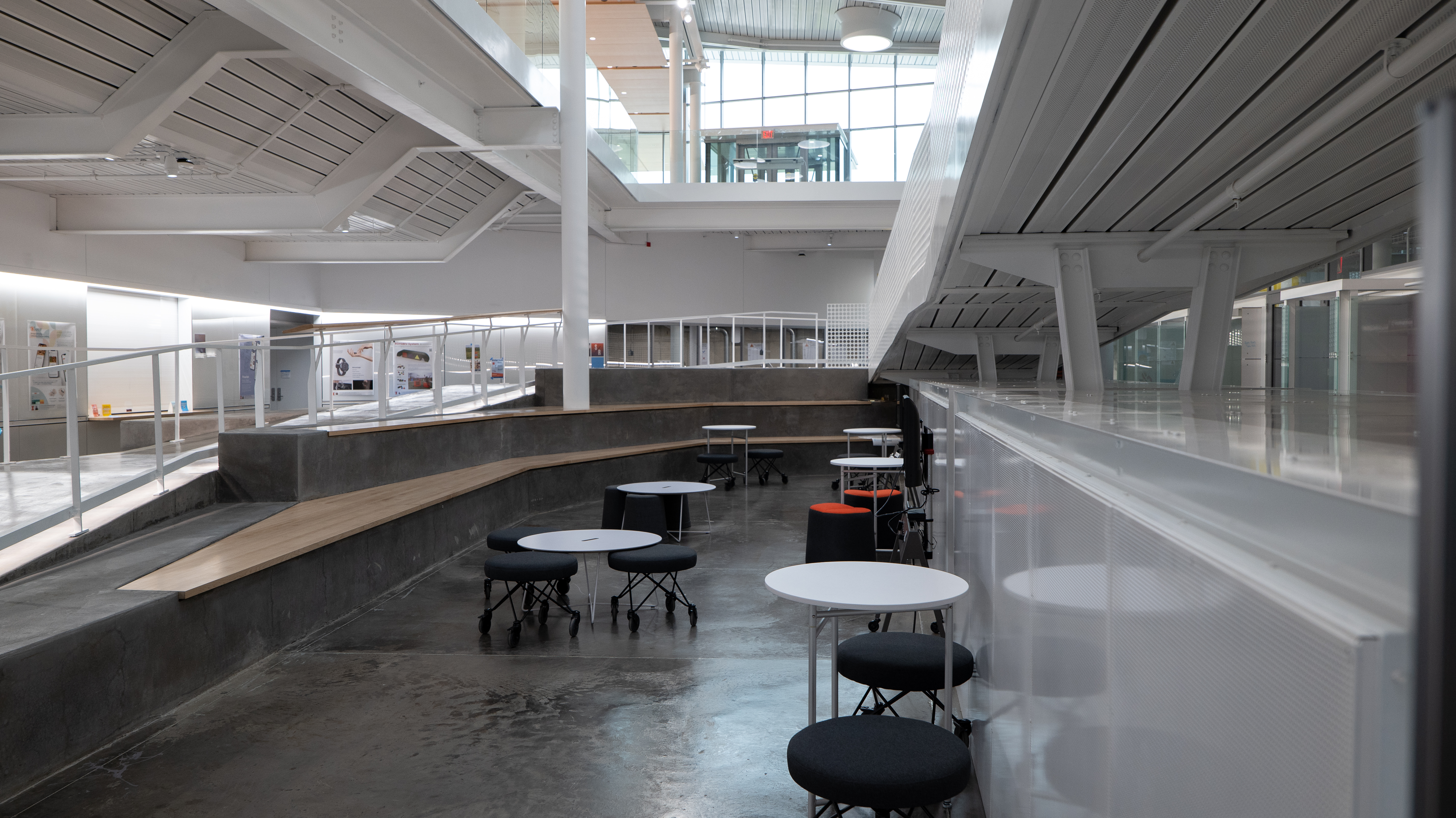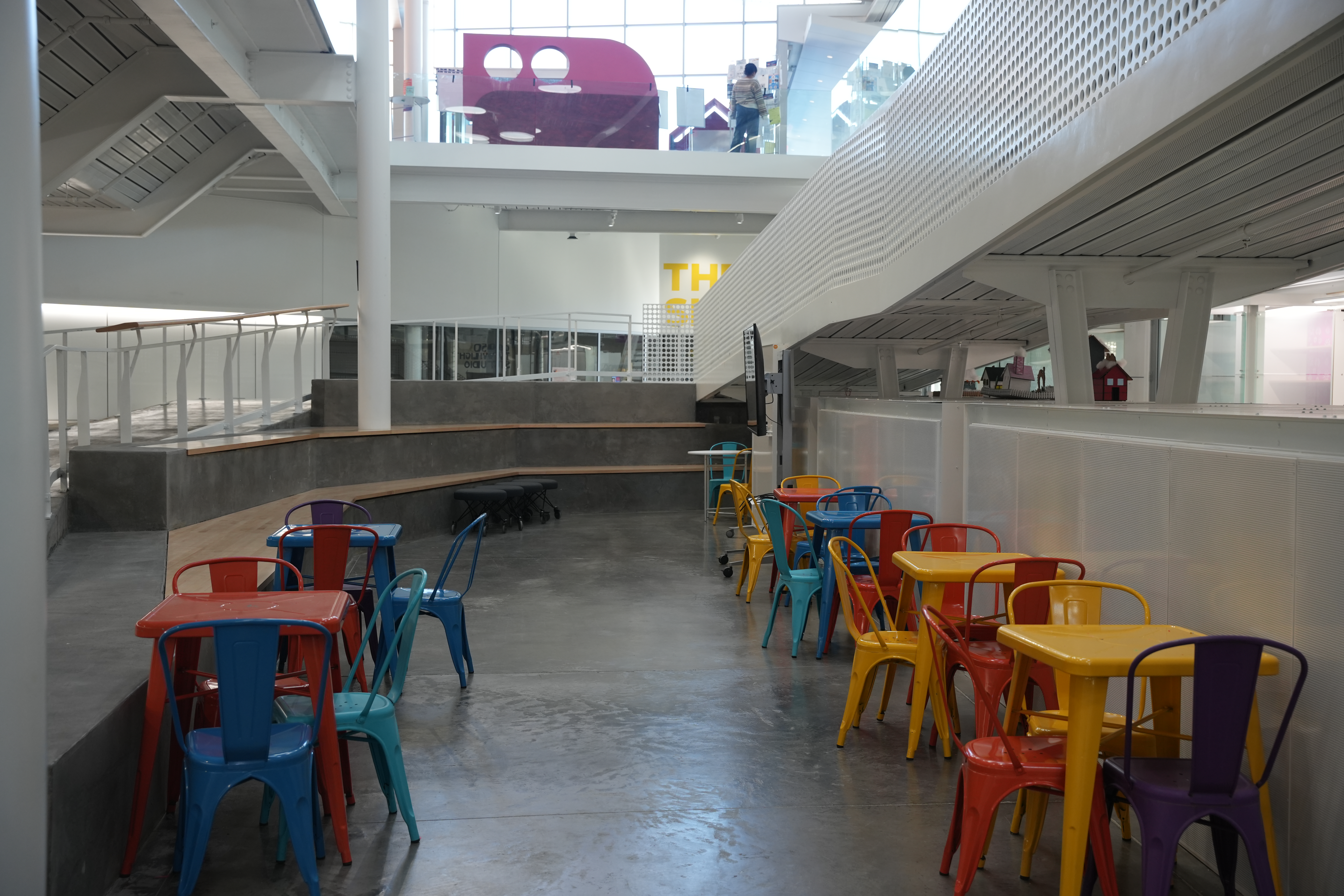 This space comes with built-in seating for up to 35, and some casual stools and coffee tables that can easily be moved. The maximum capacity for this space is 50 and all activities must stay within this limit for the safety of all guests.