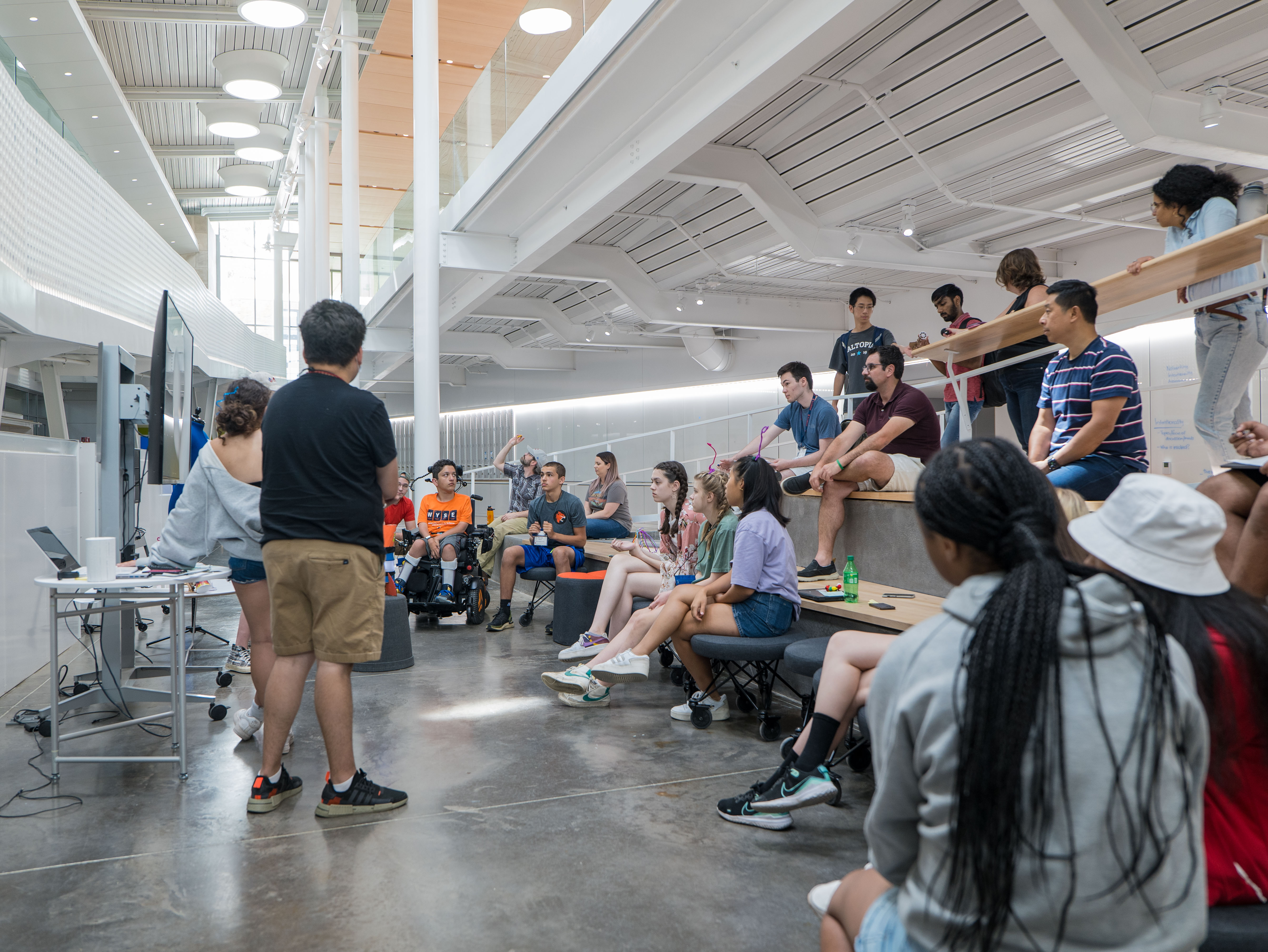 Our Amphitheater is created by the winding ramp that coils into the lower level, and can be seen from all around the building. It is a great place for sharing where others can see and hear, ideal for small presentations, lectures, poetry readings, discussion groups, critique sessions and more.