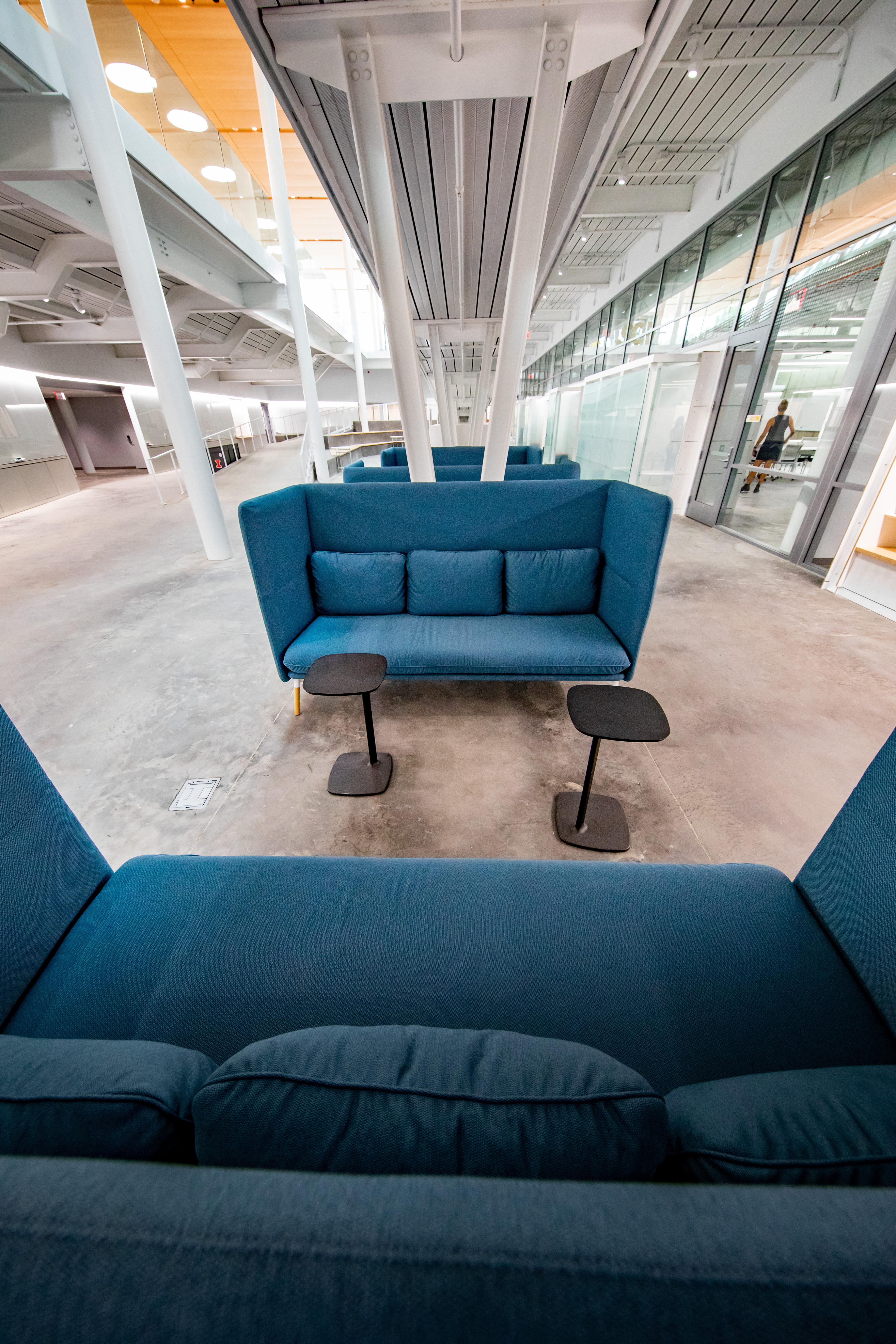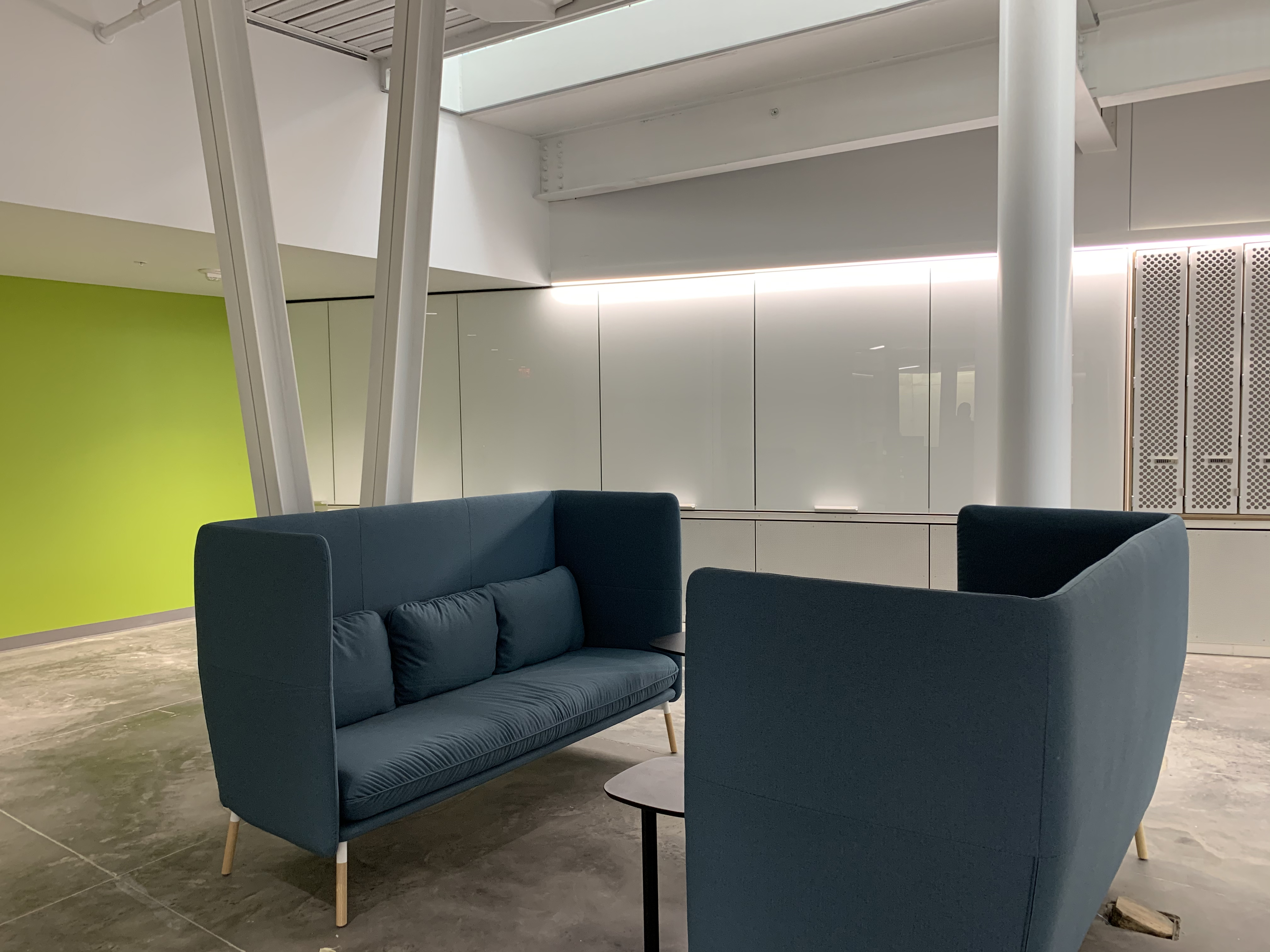 SCD's lower lobby, with its large step seating, rows of magnetic whiteboards, and tucked-away couches, is an excellent spot for students and faculty to meet, study, and work. Combined with the Amphitheater, this space makes up the open areas of the lower level, and can be host to events, poster sessions, and other activities.