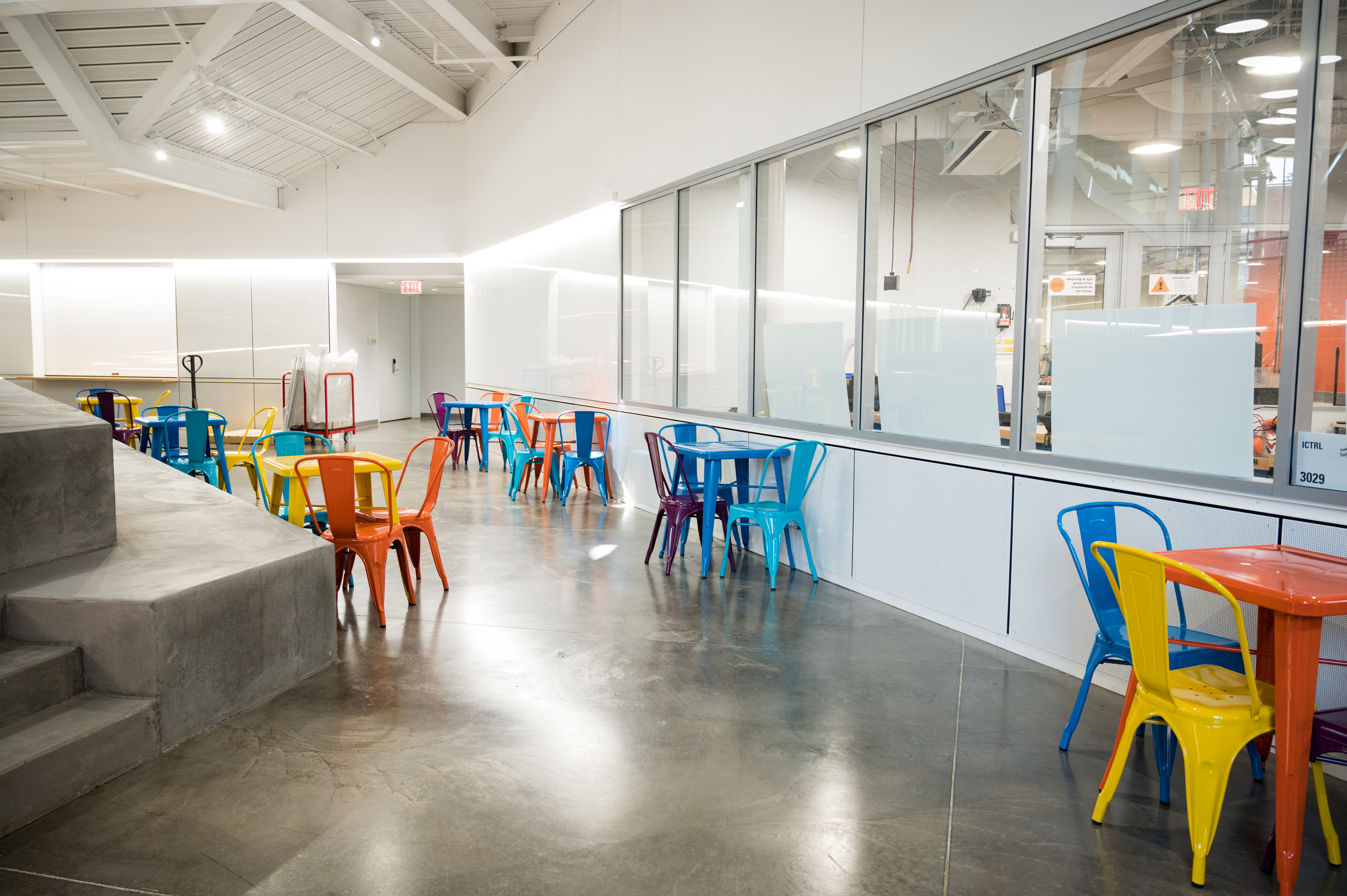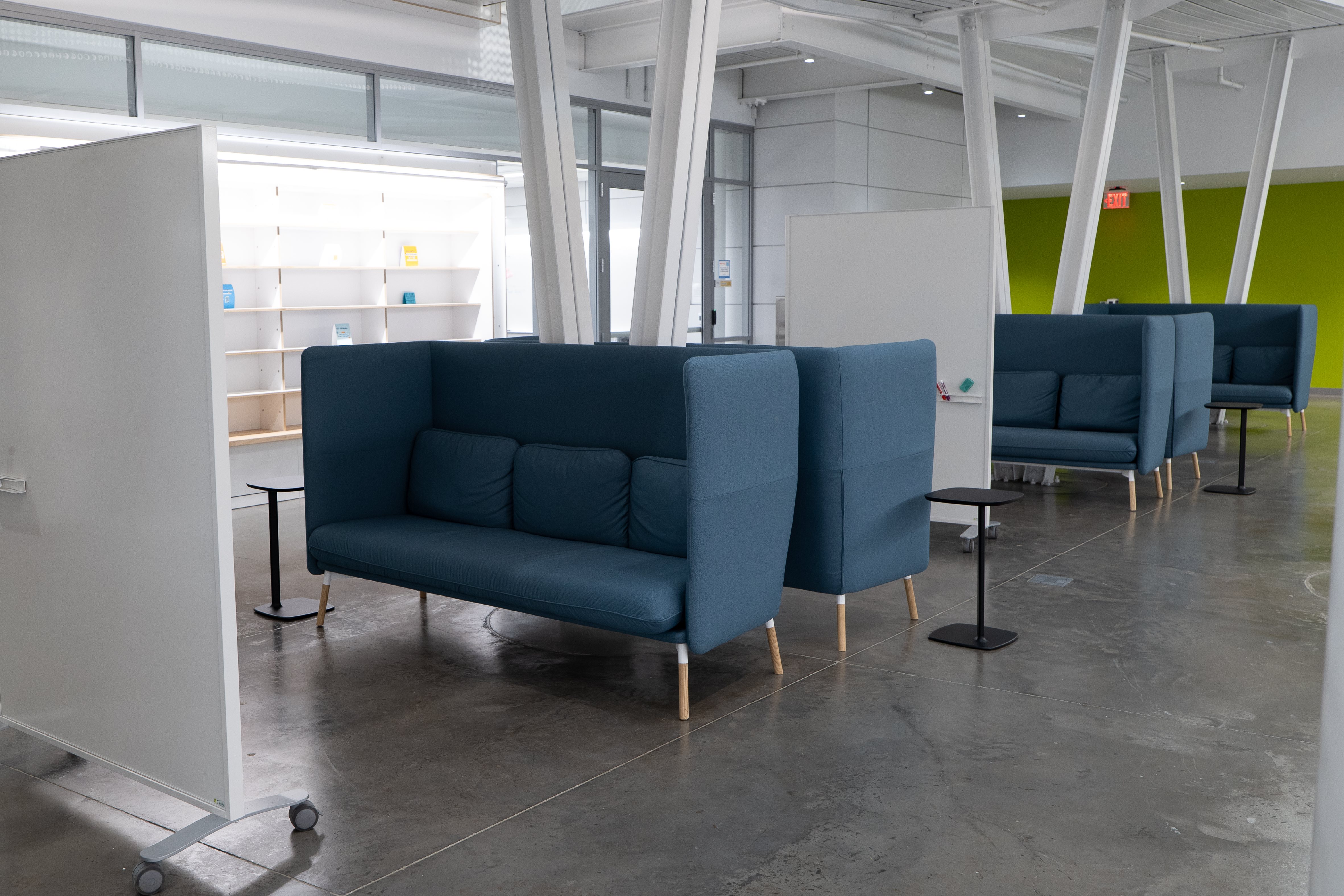 This space comes with Flexible seating and tables for up to 40, as well as couches and concrete benches for up to 60 more. The maximum capacity for this space is 150 and all activities must stay within this limit for the safety of all guests.