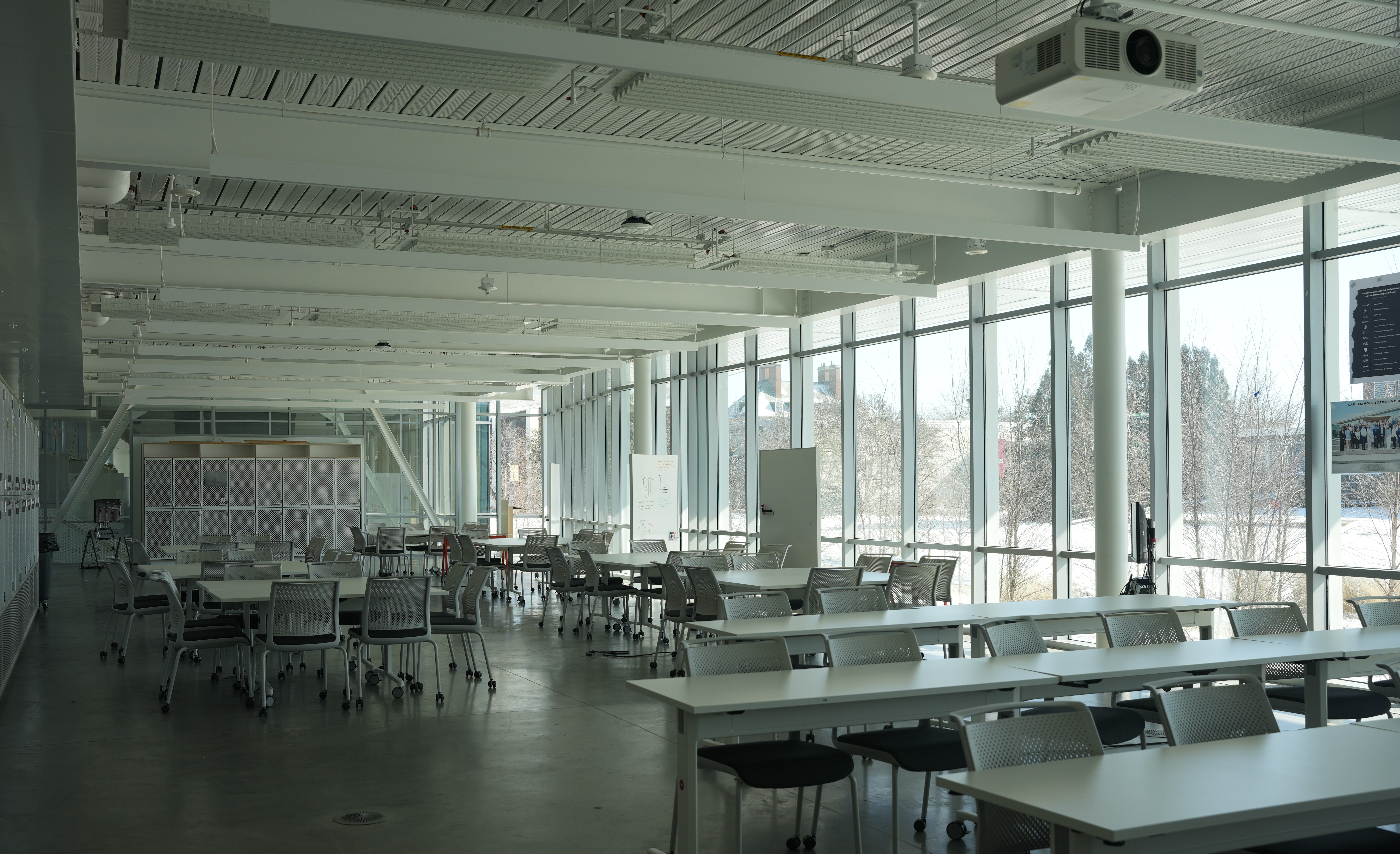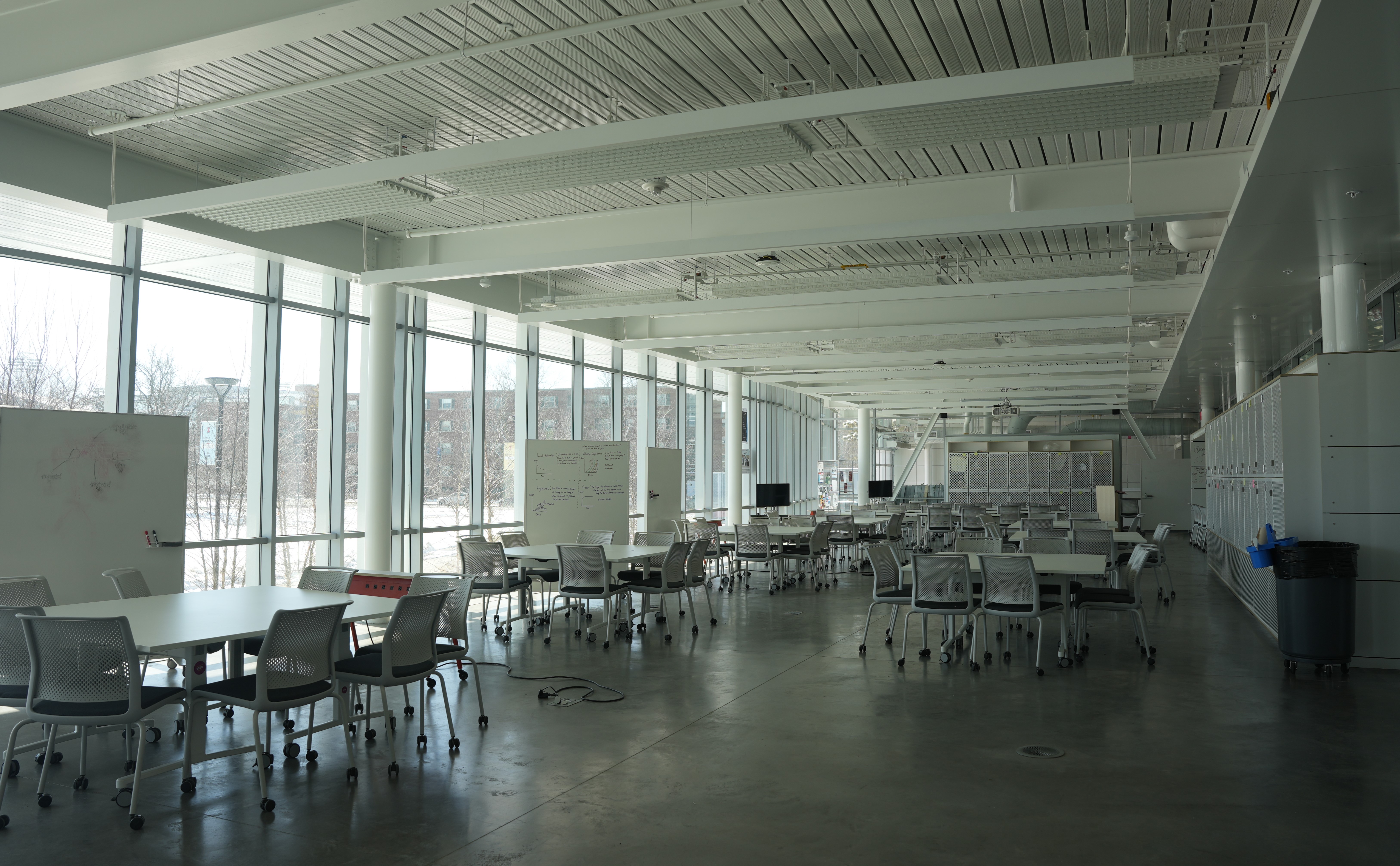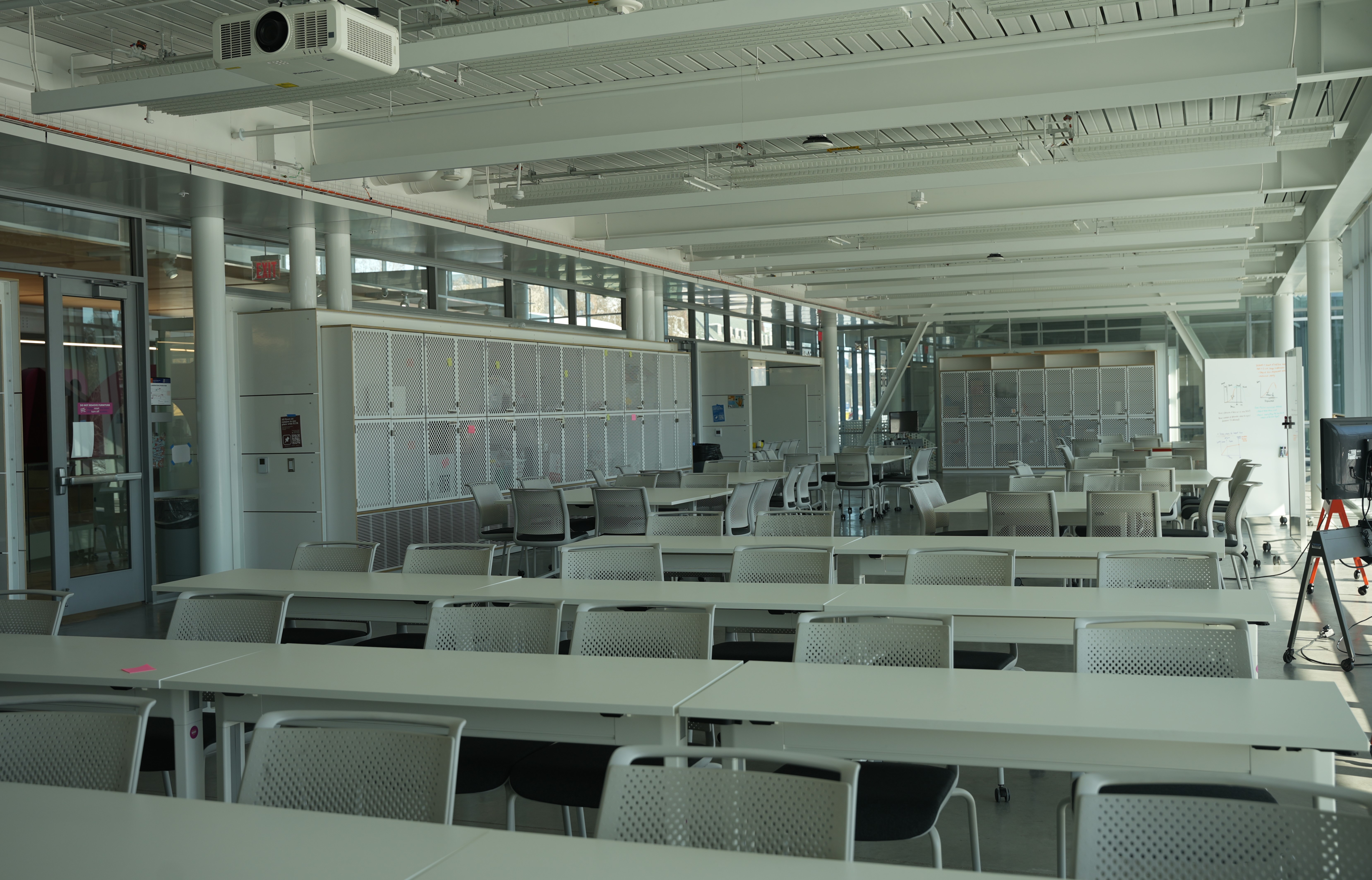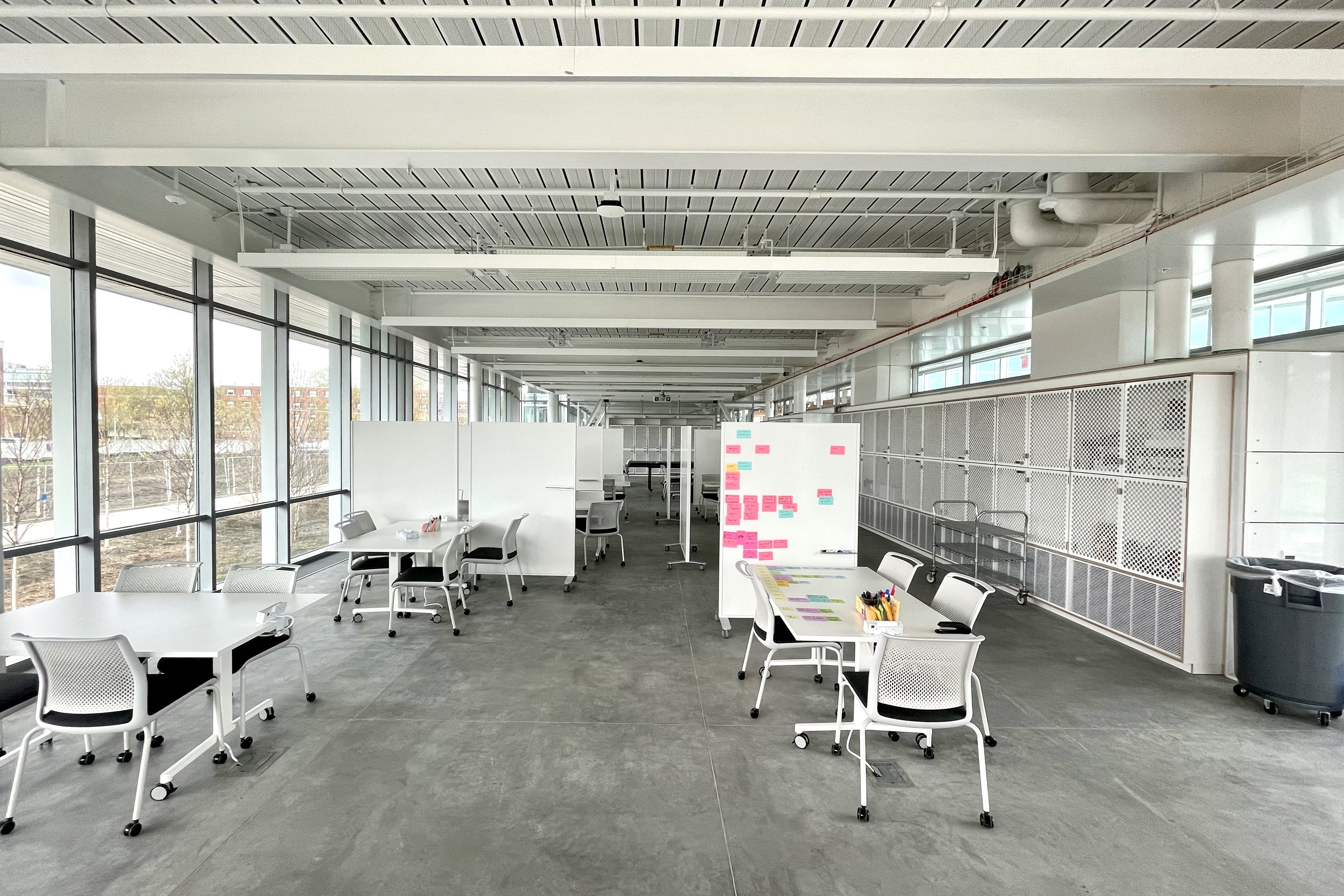 Located on the upper level, the Sunset Studio is a space designed to host "resident" student groups and project teams, where they can reserve lockers, book meeting spaces, and collaborate with other residents on events and programming. The room is a shared studio, with open and flexible work spaces meant to encourage interaction and engagement among teams.