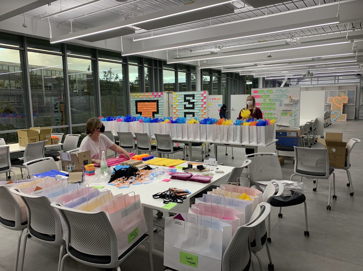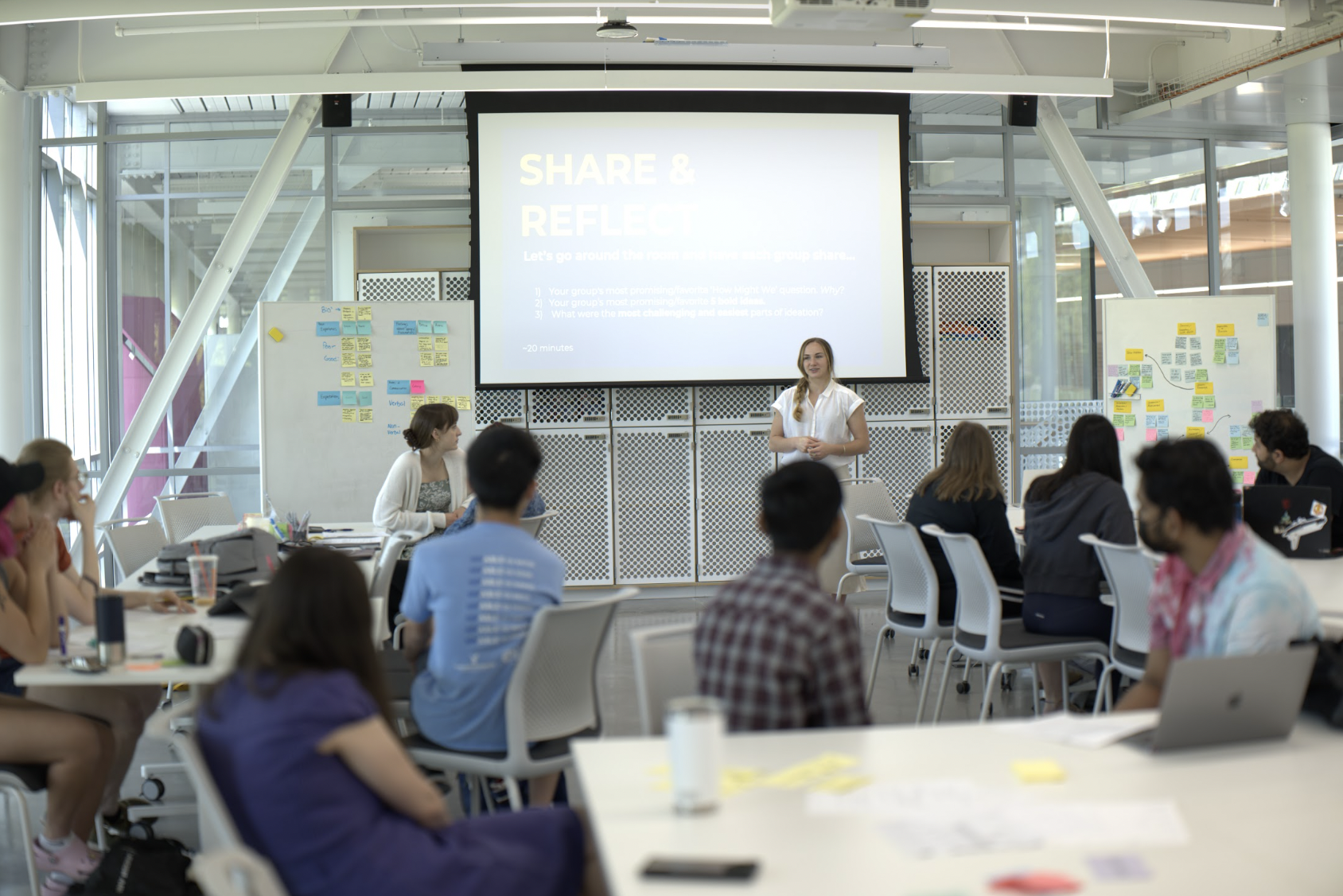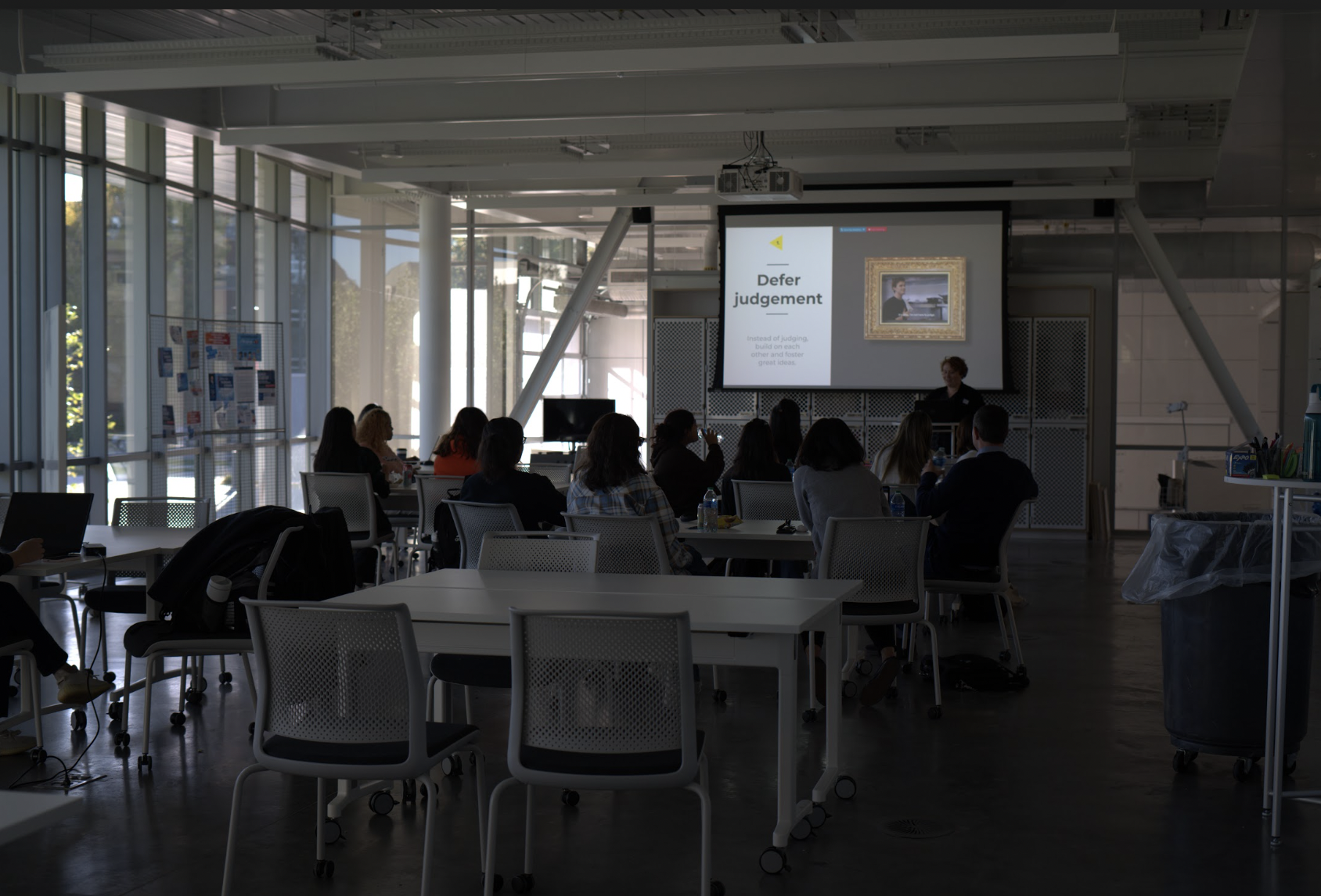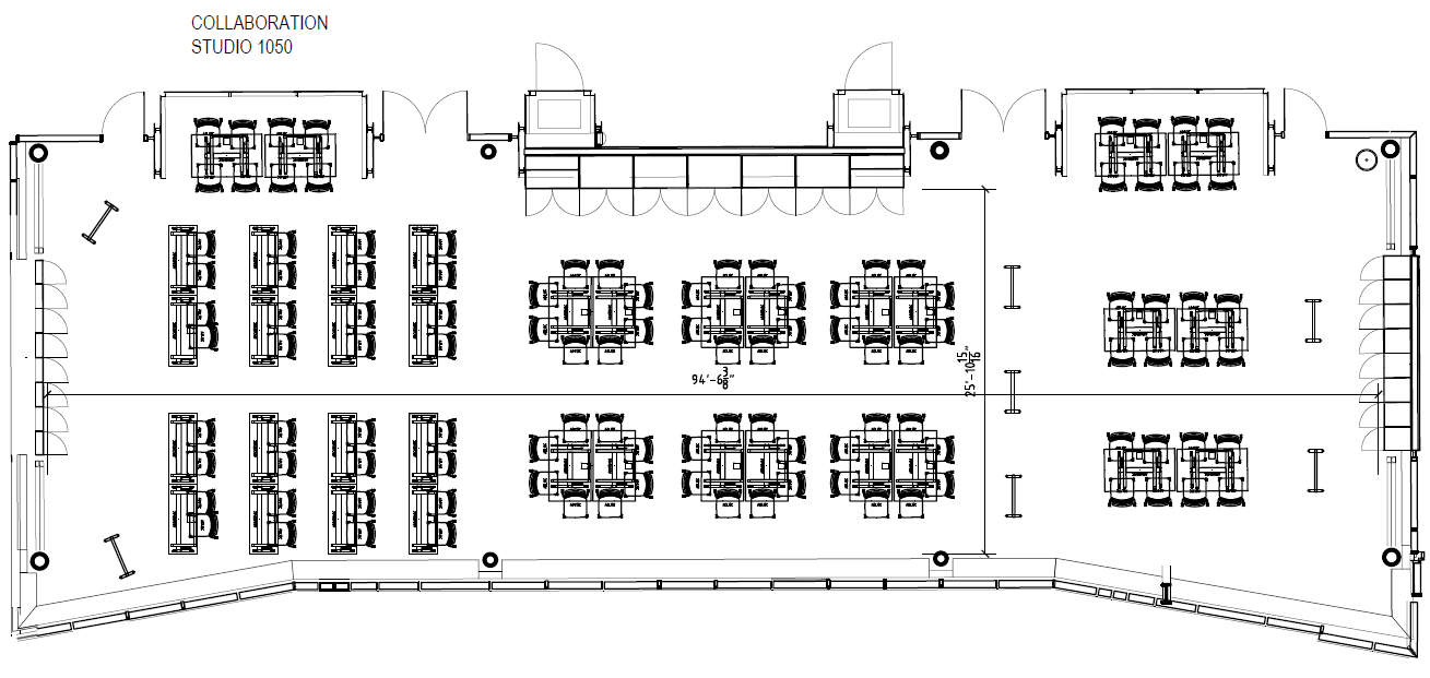 Located on the upper level, the Sunset Studio is a space designed to host "resident" student groups and project teams, where they can reserve lockers, book meeting spaces, and collaborate with other residents on events and programming. The room is a shared studio, with open and flexible work spaces meant to encourage interaction and engagement among teams.